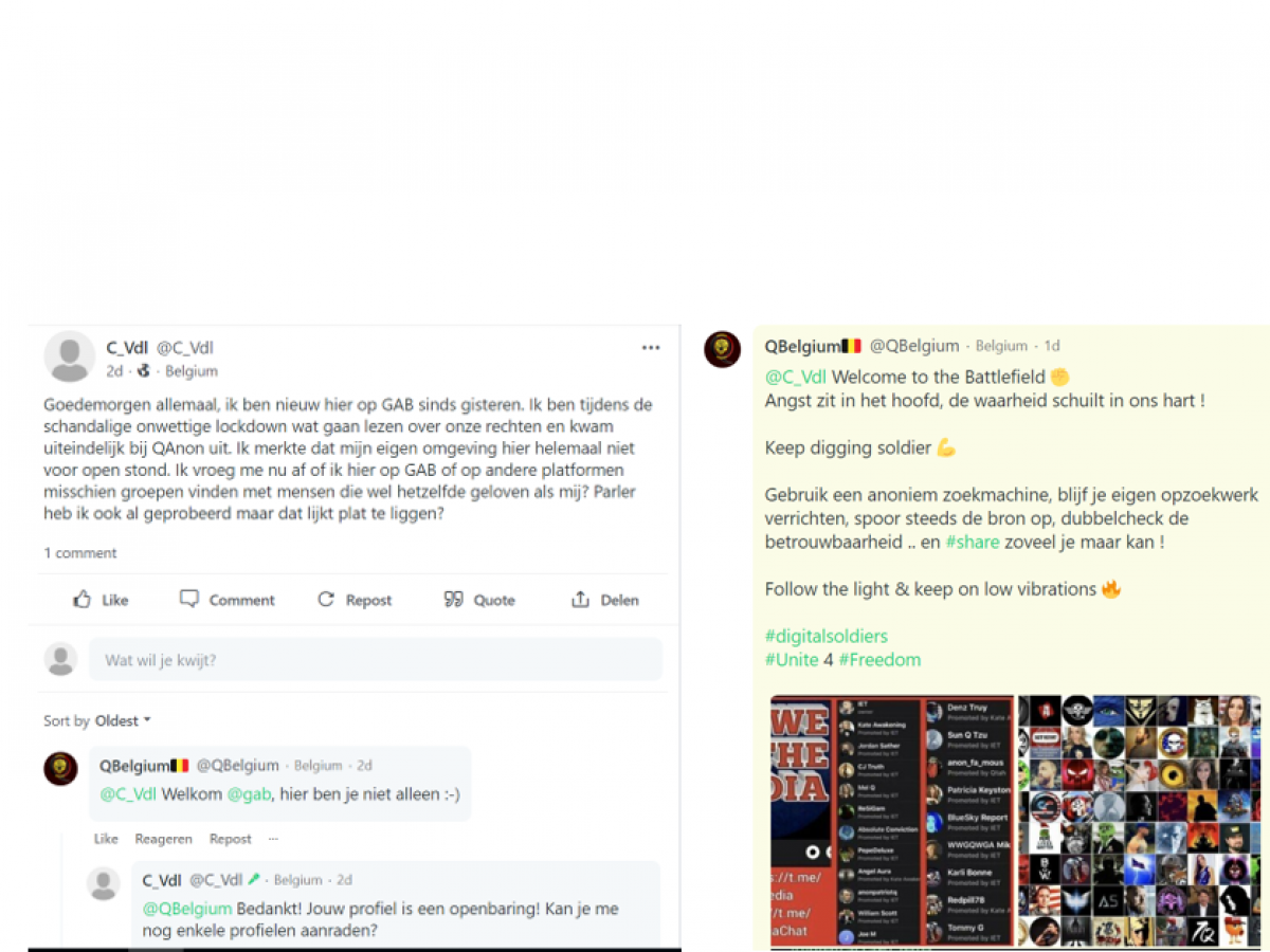 In tegenstelling tot Twitter beschikt Gab niet over een chatfunctie. Daarom besluiten we een bericht te posten in de groep om interactie uit te lokken. Nog dezelfde dag krijgen we een reactie van een gebruiker genaamd “QBelgium”. Dat account is de eerste rasechte QAnon-volger die we vinden. Hij vervloekt Bill Gates en vraagt om pedofielen te traceren en op te volgen in plaats van gezonde mensen. Hij herinnert ons aan verschillende pedofilieschandalen zoals de zaak Dutroux of de Roze Balletten en beweert dat de politieke hoofdrolspelers hierin vrijuit zouden gegaan zijn. Hij deelt ook verschillende foto’s waarop prominente Belgen zoals Charles Michel poseren met Bill Gates. Het account lijkt grotendeels een doorgeefluik van vooral Amerikaanse theorieën. Een Amerikaanse verpleegster doorbreekt de stilte. Ze beweert dat vaccins niet getest en niet effectief zijn. Sinds het begin van de vaccinatiecampagne zouden Covid-besmettingen explosief gestegen zijn. Meermaals wordt herhaald dat de verkiezingen gestolen zijn.