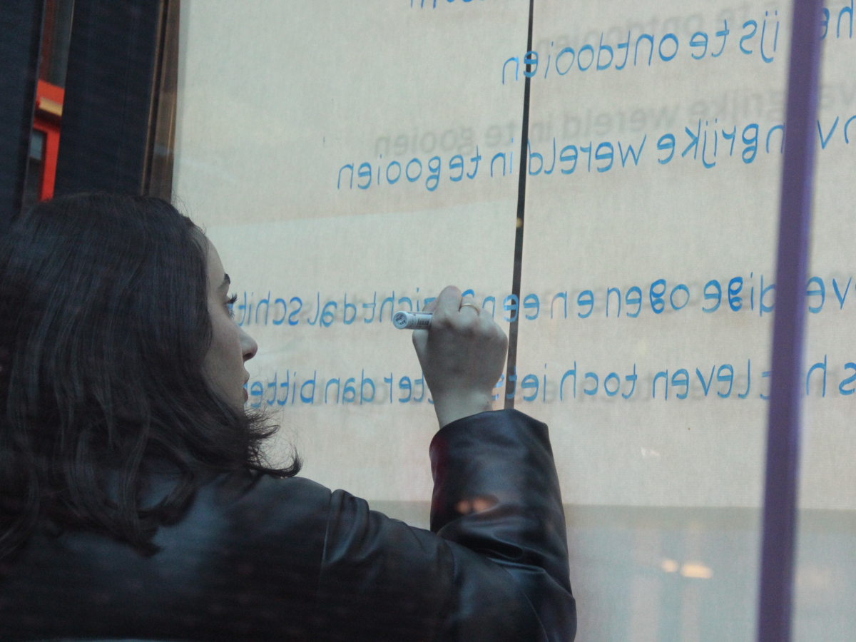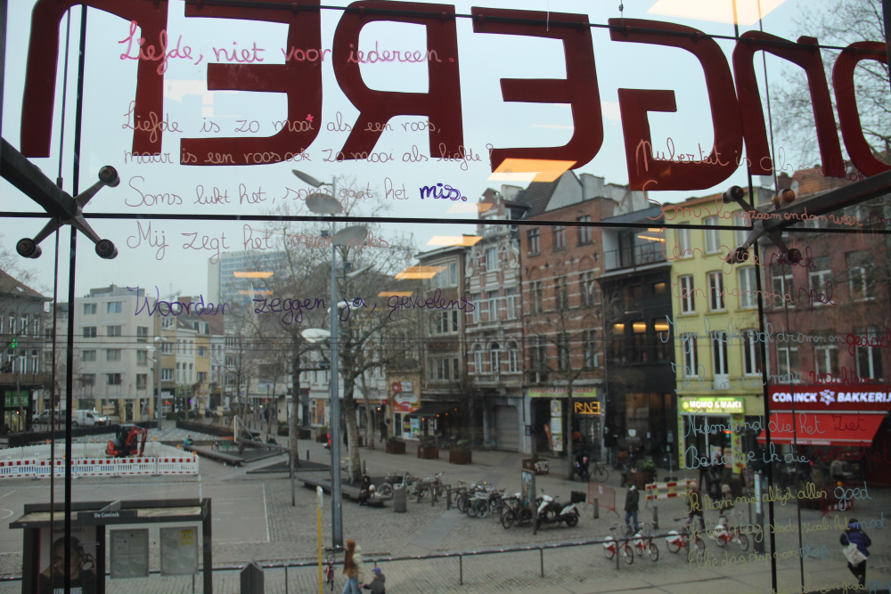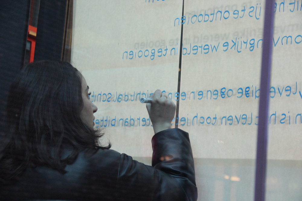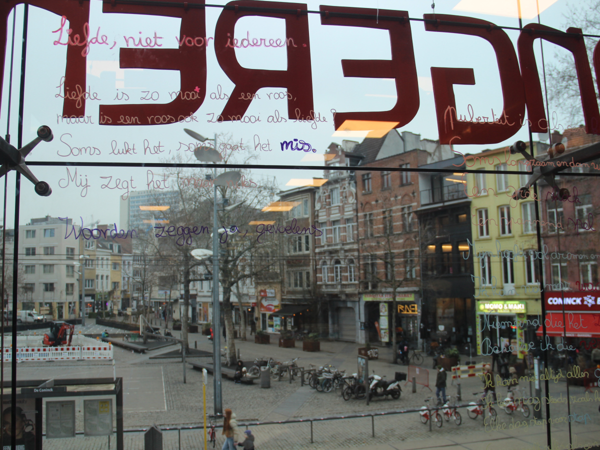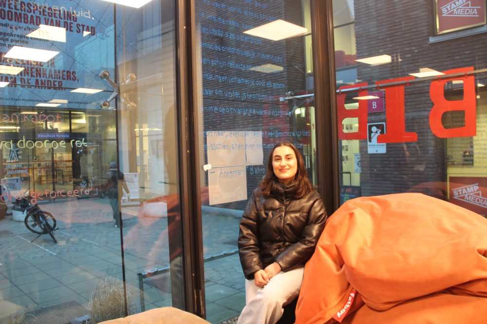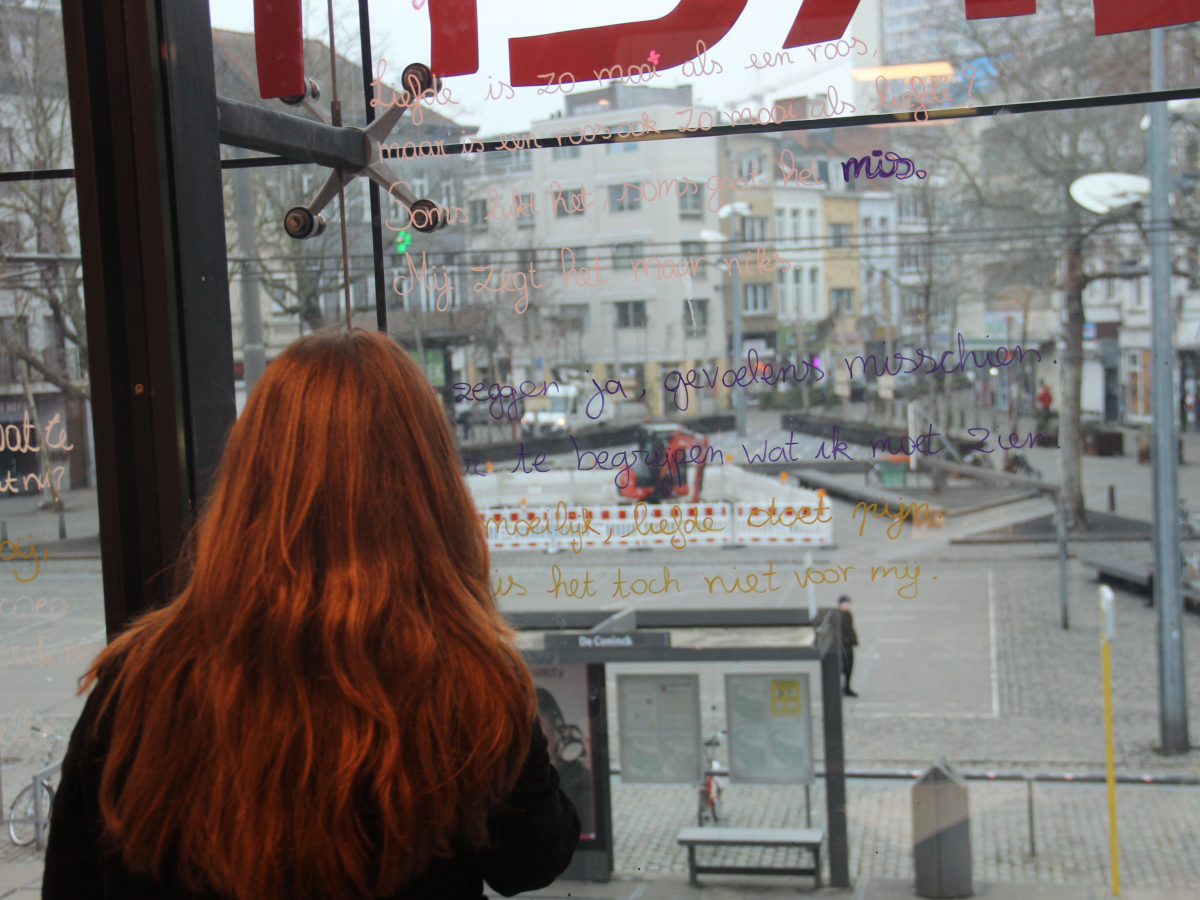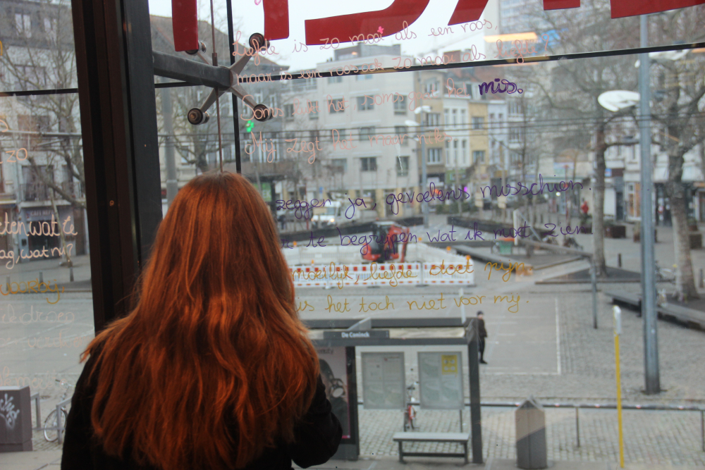 De Poëzieweek vond dit jaar plaats van 29 januari tot 4 februari, met als thema metamorfose. In Kubus, de jongerenbib van Permeke, schreven Annemarie Bahro, Mohamed Amin Farfach en Safa Abdullah tijdens die week een gedicht op de ramen. “Ik vond het een heel mooie kans van de bib om ruimte te maken voor jonge dichters. Het thema metamorfose is een bruisend onderwerp dat leeft tussen de jongeren. Ik zou het graag nog eens doen”, zegt Mohamed Amin.