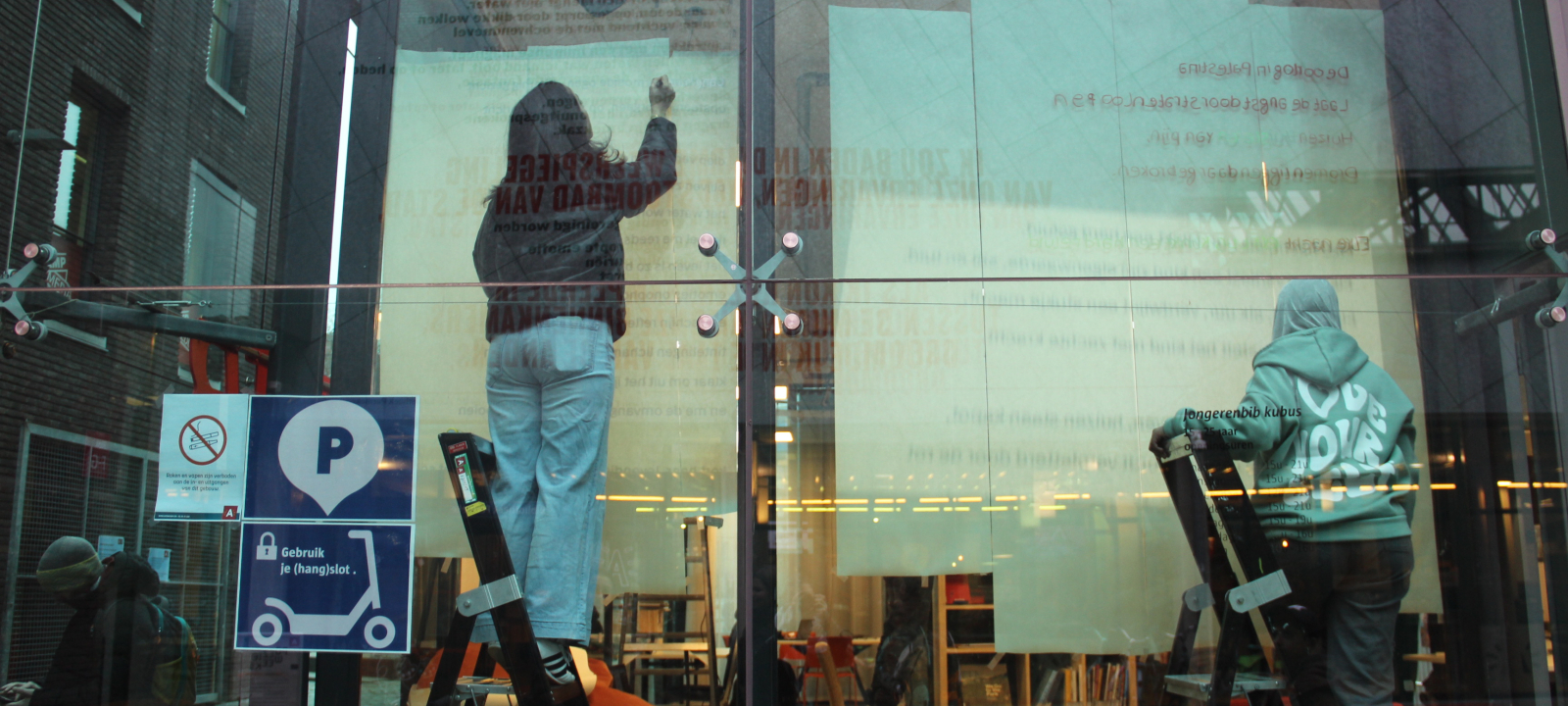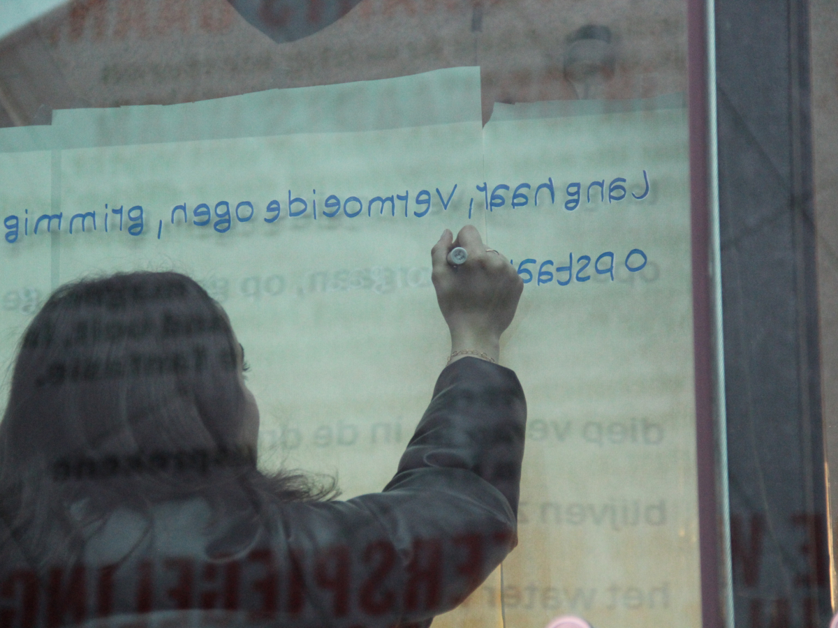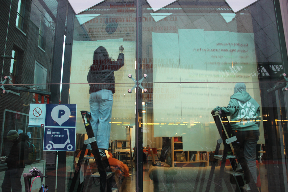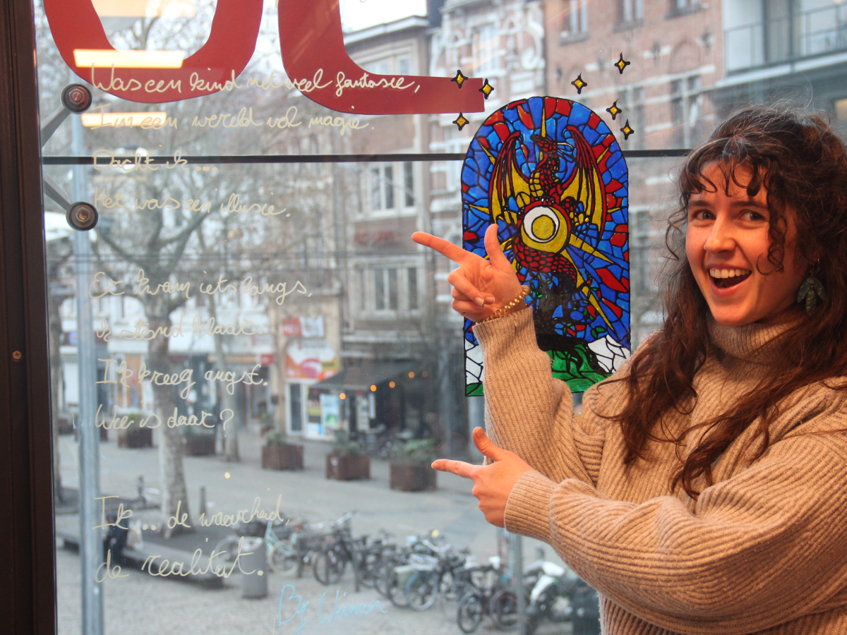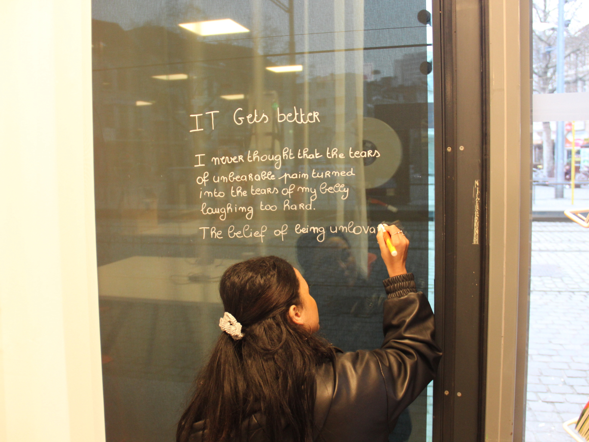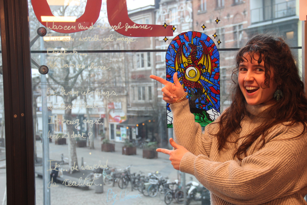 De Poëzieweek vond dit jaar plaats van 29 januari tot 4 februari, met als thema metamorfose. In Kubus, de jongerenbib van Permeke, schreven Annemarie Bahro, Mohamed Amin Farfach en Safa Abdullah tijdens die week een gedicht op de ramen. “Ik vond het een heel mooie kans van de bib om ruimte te maken voor jonge dichters. Het thema metamorfose is een bruisend onderwerp dat leeft tussen de jongeren. Ik zou het graag nog eens doen”, zegt Mohamed Amin.
